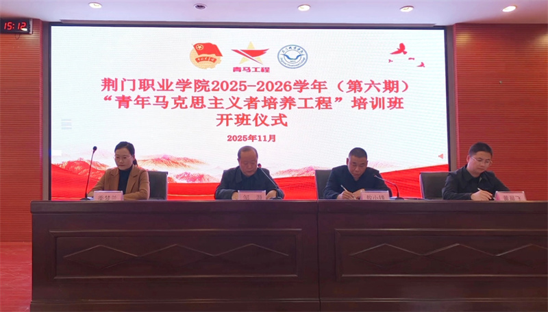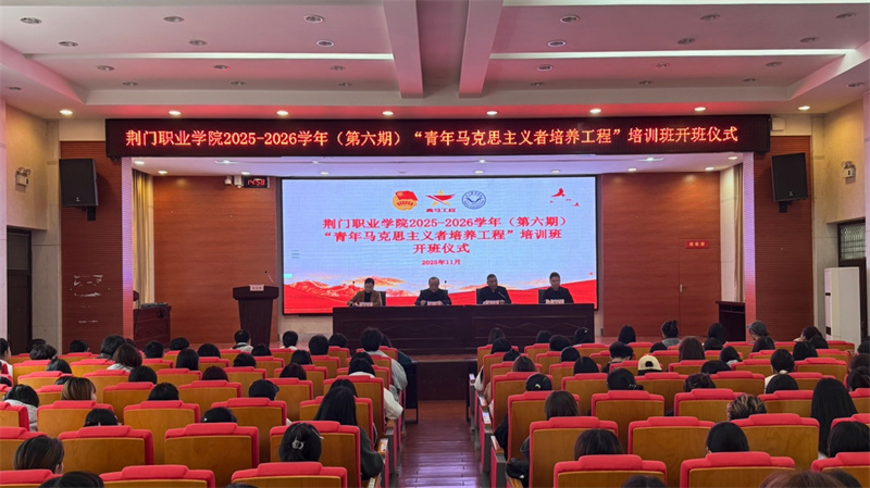 當(dāng)前位置:首頁 >> 學(xué)生工作 >> 共青團(tuán)工作 為著力培養(yǎng)堅定的青年馬克思主義者,荊門職業(yè)學(xué)院2025-2026學(xué)年(第六期)“青年馬克思主義者培養(yǎng)工程”培訓(xùn)班于11月11日15時在職教會堂正式開班。荊門職業(yè)學(xué)院黨委書記鄒灝作開班動員講話,副院長敖小鋒主持開班儀式,馬克思主義學(xué)院黨支部書記黃晨飛,校團(tuán)委全體成員,各學(xué)院團(tuán)總支書記及第六期“青馬工程”全體學(xué)員參加本次培訓(xùn)。同時,學(xué)校也組織各班級團(tuán)支書參加本次開班儀式并同步參與學(xué)習(xí)。
