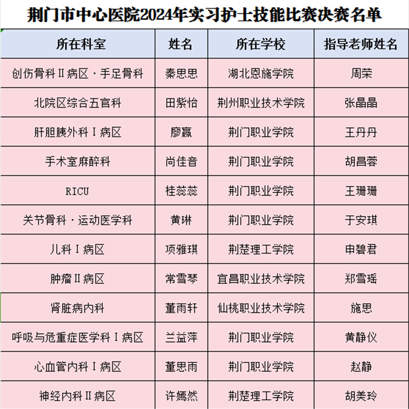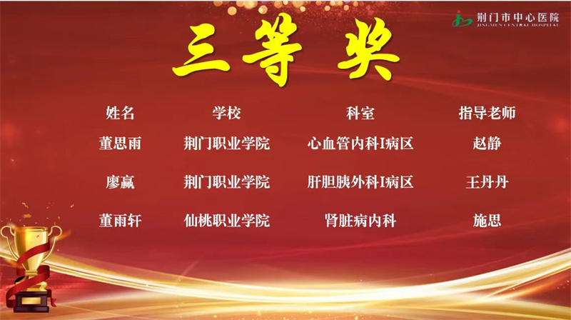 為進(jìn)一步規(guī)范實(shí)習(xí)生臨床護(hù)理技術(shù)操作,提升專業(yè)技能水平,展示護(hù)理的卓越風(fēng)采。2024年11月20日,荊門市中心醫(yī)院舉辦了以“理論為基,技能為翼,成長(zhǎng)為魂”為主題的第六屆實(shí)習(xí)護(hù)士技能競(jìng)賽。荊門職業(yè)學(xué)院醫(yī)學(xué)院桂蕊蕊、董思雨、廖贏、尚佳音、黃琳、蘭益萍6名同學(xué)以扎實(shí)的專業(yè)技能、良好的綜合素質(zhì)分別獲得一等獎(jiǎng)、三等獎(jiǎng)和優(yōu)秀獎(jiǎng)的好成績(jī)。