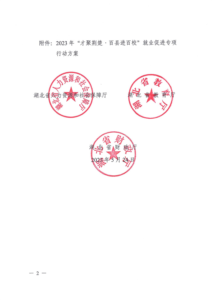 省人力資源和社會(huì)保障廳 省教育廳 省財(cái)政廳關(guān)于印發(fā)《2023年“才聚荊楚·百縣進(jìn)百?!本蜆I(yè)促進(jìn)專項(xiàng)行動(dòng)方案》的通知